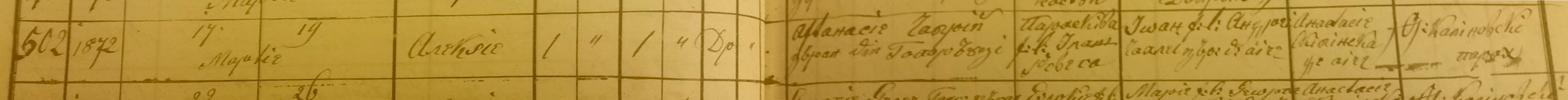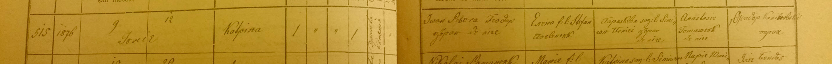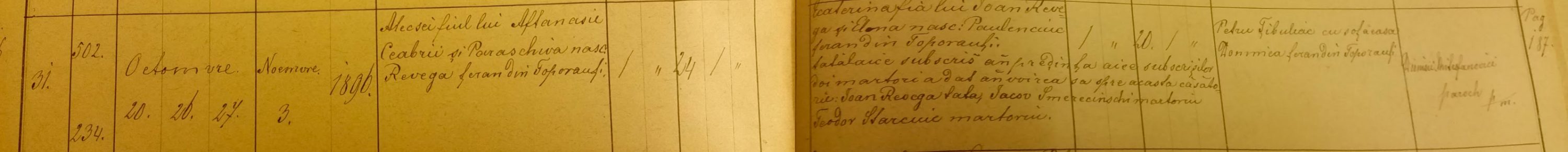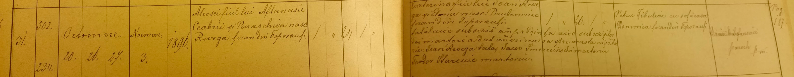 Alecsei, son of Aftanasie Ceabrii and Paraschiva Revega married Ecaterina, daughter of Ioan Revega and Paulenciuc. Alecsei was 24 and Ecaterina 20 years old.