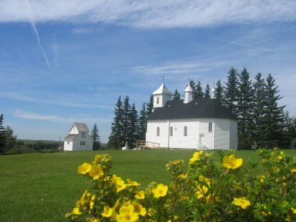 By the summer of 1905, the building was completed and a Russian Orthodox priest from Wostok, in all probability Father Mihailo Skibinski, was invited to come and consecrate the church. On Aug. 2 the consecration took place. What a joyous occasion for all the members! They came from far and near, on foot, or by wagons drawn by horses or oxen, following the trails that led to the church on the hill. Everyone enjoyed the festivities and left with a feeling of pride and satisfaction. In 1918 the building was covered with siding and the in 1948 stucco replaced the siding and the entrance was modified. The stone foundation was covered with concrete. The roof too has been repaired and active members of the community for having taken, through the years, such excellent care of the building that it is as solid today as the day it was completed.