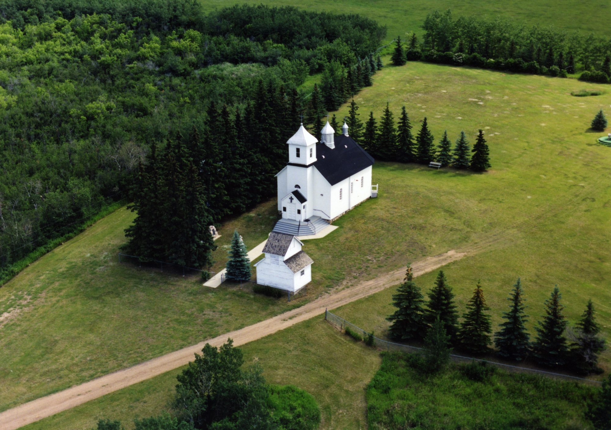 By the summer of 1905, the building was completed and a Russian Orthodox priest from Wostok, in all probability Father Mihailo Skibinski, was invited to come and consecrate the church. On Aug. 2 the consecration took place. What a joyous occasion for all the members! They came from far and near, on foot, or by wagons drawn by horses or oxen, following the trails that led to the church on the hill. Everyone enjoyed the festivities and left with a feeling of pride and satisfaction. In 1918 the building was covered with siding and the in 1948 stucco replaced the siding and the entrance was modified. The stone foundation was covered with concrete. The roof too has been repaired and active members of the community for having taken, through the years, such excellent care of the building that it is as solid today as the day it was completed.