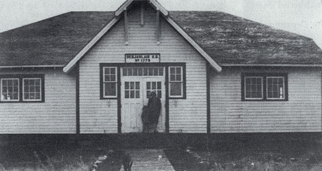The Desjarlais S.D. #1779 was established on March 11, 1908. It was comprised of the following lands: Sections 33-36 inclusive in township 56, range 14; sections 1-10 inclusive, 16, 17 and those portions of sections 11, 12, 15, 20, 21 and 29 lying South and West of the Saskatchewan River in twp. 57, rge. 14, W. of 4th. The senior trustee was Thos. Strenatka of Desjarlais. On March 26, 1910 the following lands were added: sec. 26, 27 and 28 in same township. On April 5, the same year, the district borrowed eight hundred dollars for the purpose of building and furnishing a school. The treasurer was Wm. Hawreliak of Shandro, Alberta. On June 28, 1910 a site was selected at S.E. corner of section 4, in twp. 57, rge. 14, W. of 4th. The one room school was built and classes began. During the next few years lands were withdrawn or added. A serious problem existed in that the school was not centrally located so that the children living near the river had some four miles to walk to school. In 1925 the school burned to the ground and a new school was to be built. In the interval classes were held in a farm house.