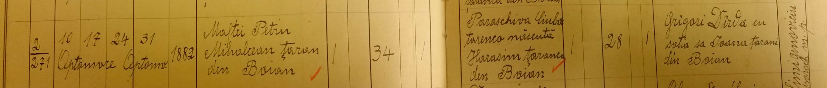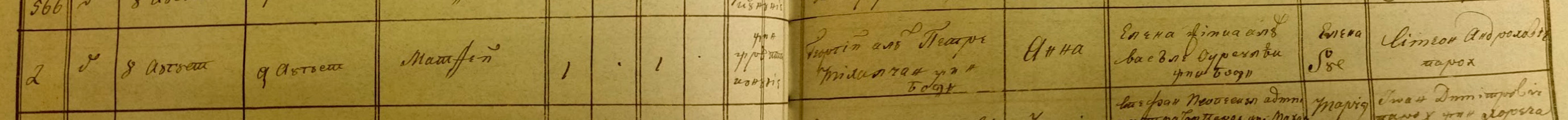 Maftei, son of (George are missing – priest mistake) who was son of Petru Mihalcean married Paraschiva (Sirbu. She was widow) Harasam. Godparents – Grigore and Ioana Darda