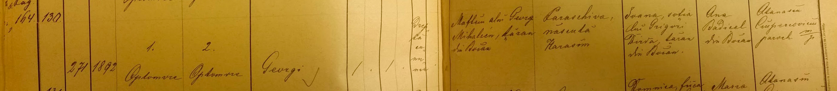 George was born on Oct.1 1892. Father – Maftei, son George Mihalcean. Mother – Paraschiva Harasam. Godmother – Ioana, wife of Grigore Darda.