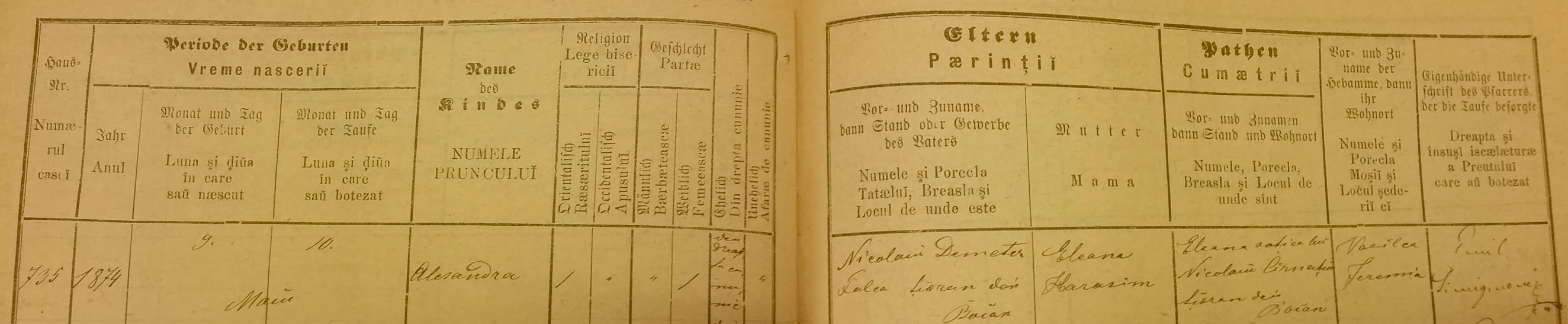 Alexandra was born May 9, 1874. Father – Nicolai, son of Dumitru Falca. Mother – Eleana Harasim. Godmother – Eleana, wife of Nicloai Carnatiu.