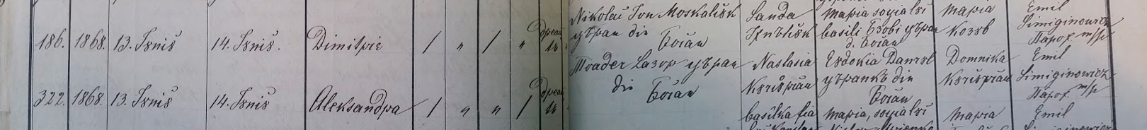 Dimitrie, son of Nicolai, who was son of Ioan Moskaliuk and Alexandra Ichnatiuc, on age 23, was married with Alexandra, daughter of Nicolai Falca and Ileana Harasam, 17 years old. Godparents was Sava and Maria Sarbul.