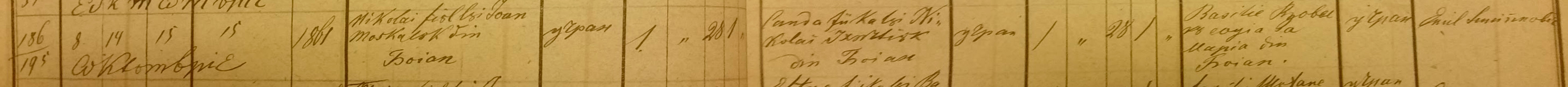 Nikolai, son of Ioan Moskaliuk on age 28 married Sanda, daughter of Nikolai Ihnatiuk, 28 years old. Godparents – Vasile and Maria Bizovi.
