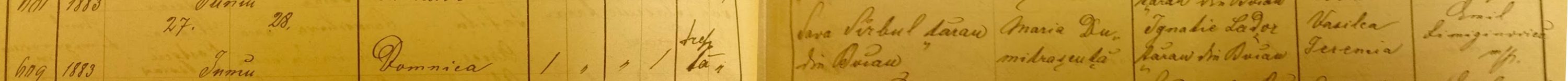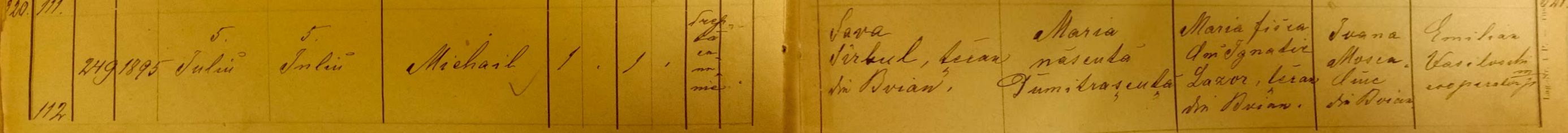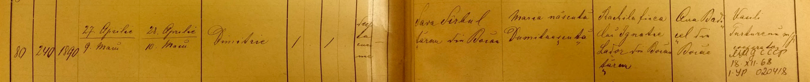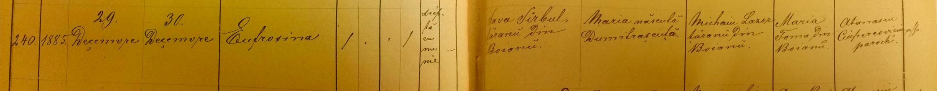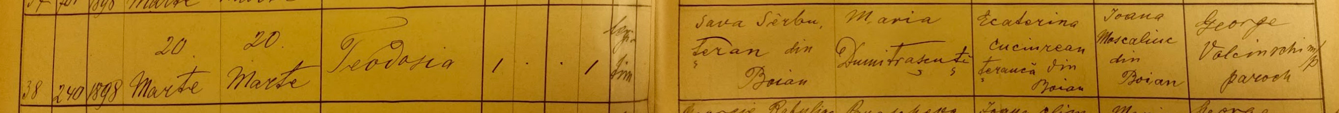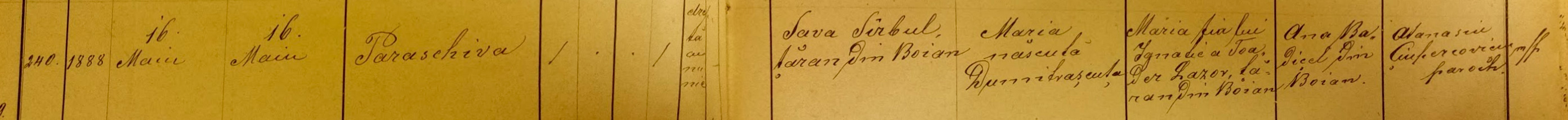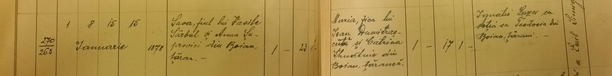 Sava, son of Vasile Sarbul and Ana Suprovich married Maria, daughter of Ioan Dumitrascuta and Catrina Ihnatiuc. Godparents – Ignatie and Teodosia Lazar.