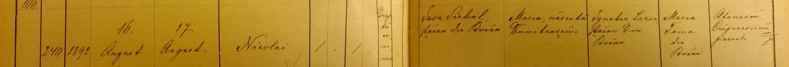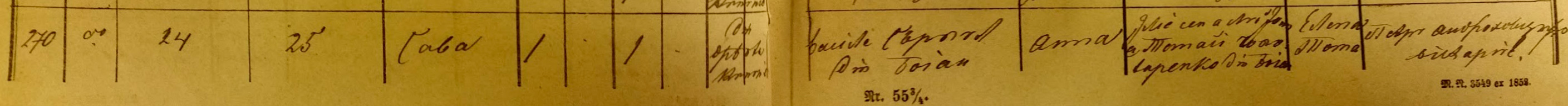 Sava was born on Apr, 24 1855. Father – Vasile Sarbul. Mother – Ana. Godfather – Ilie, son of Ion, son of Nicolai Cebotarenco.