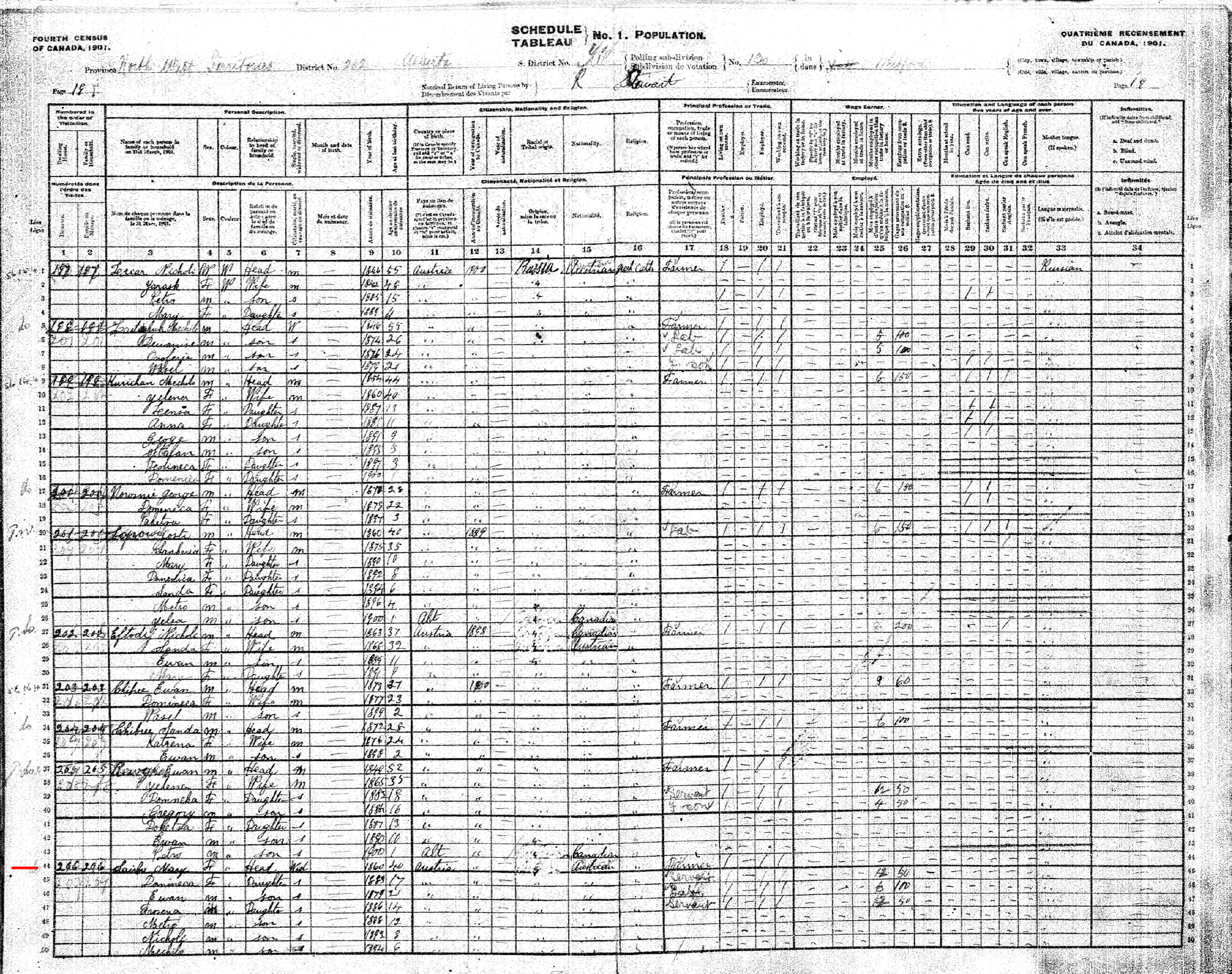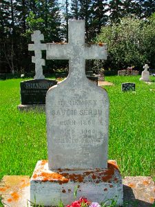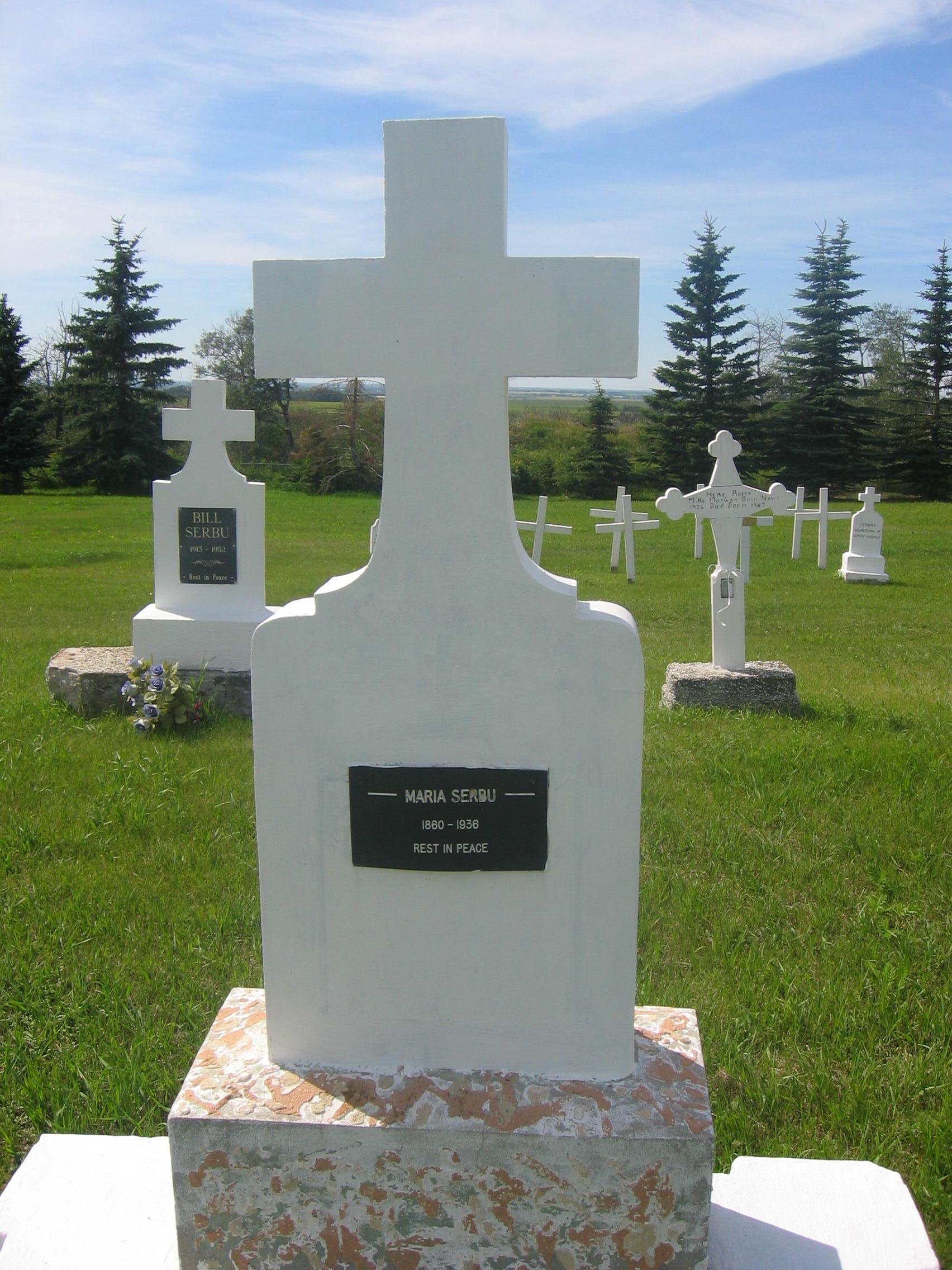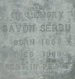Sava Serbu was born in 1855 in Boian, Bucovina and his wife Maria (née Dumitrashchuk) was born in 1860 also in Boian. In 1899 they emigrated to Canada and spent the first winter in a bordei close to Andrew. They had brought as many household items as they could which included clothing, home spun blankets, cups, wooden spoons, some pots and the top of a shparhut (sparhat). There were seven children in the family, John, Domnica, Frozina, Petre, Nicolai, Mike (Mihai) and Todosia. In the early spring of 1900 they moved to Boian where Sava had already built a small log house. Later in spring when Sava was returning home through melting snow and mud he caught a severe cold which developed into pneumonia and despite Maria’s frantic efforts to save him with known remedies of the day, he died. Since there was no cemetery at Boian, Sava was laid to rest in a home-made coffin in the cemetery at Shandro. Maria was left a young widow with a large family in a strange country. How helpless and lonely she must have felt!