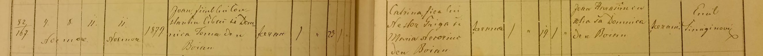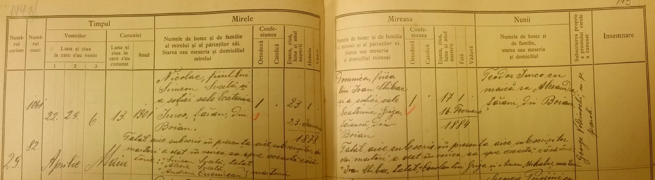 Ioan, son of Constantin Chibac and Domnica Toma married Catrina, daughter of Nestor Griga and Maria Necoriuc. Godparents – Ioan and Domnica Harasam. Ioan was 23 and Domnica 19 years old.