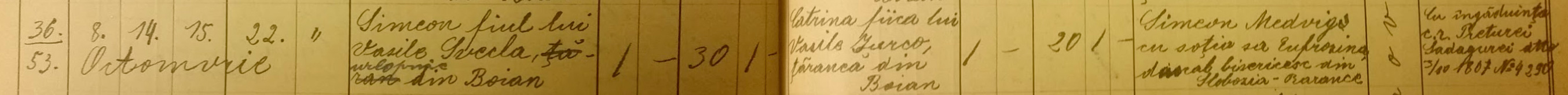 Simeon , son of Vasile Svecla married Catrina, daughter of Vasile Iurco. Godparents – Simeon and Eufrosinia Medvig from Slobozia-Rarance. Simeon was 30 and Catrina 20 years old.