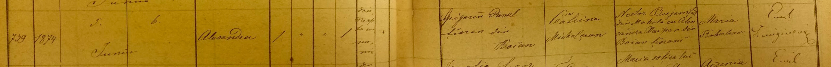 Alexandra was born on June 5, 1874. Father – Grigore Pavel. Mother – Catrina Mihalcean. Godparents – Nestor Bujenita from Mahala and Alexandra Vaipan from Boian.