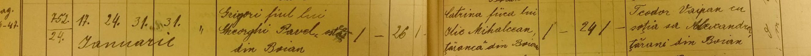 Grigori, son of Gheorghi Pavel married Catrina, daughter of Ilie Mihalcean. Godparents – Teodor and Alexandra Vaipan. Grigori was 26 and Catrina 21 years old.
