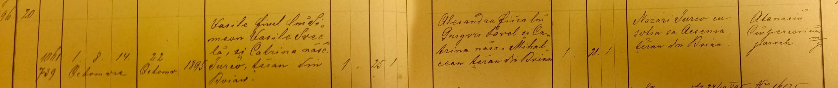 Vasile, son of Simeon, Vasile Svecla and Catrina Iurco married Alexandra, daughter of Grigori Pavel and Catrina Mihalcean. Godparents – Nazar and Acsenia Iurco. Vasile was 25 and Alexandra 21 years old.
